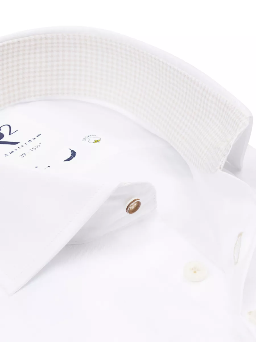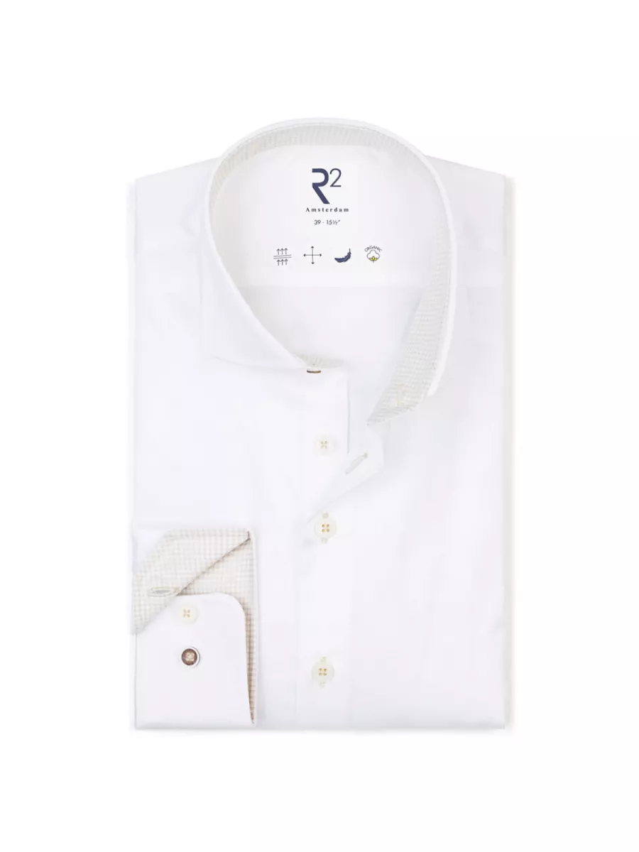 Dit strakke witte overhemd van R2 Amsterdam is vervaardigd van 100% biologisch katoen en heeft een cleane, minimalistische uitstraling. De getailleerde pasvorm, de licht gestrekte kraag en de crèmewitte knopen geven het overhemd een nette, tijdloze look. De binnenkant van de kraag is afgewerkt met een fijne grijsbeige ruitmotief als subtiel kwaliteitsdetail. Dit is een veelzijdig basisoverhemd dat uitstekend combineert met zowel een pak als een casual broek. Materiaal: 100% Biologisch Katoen.