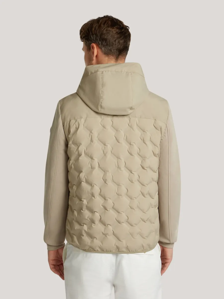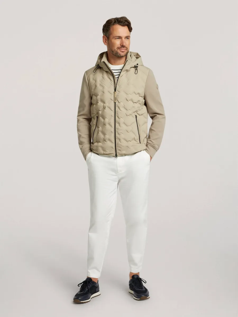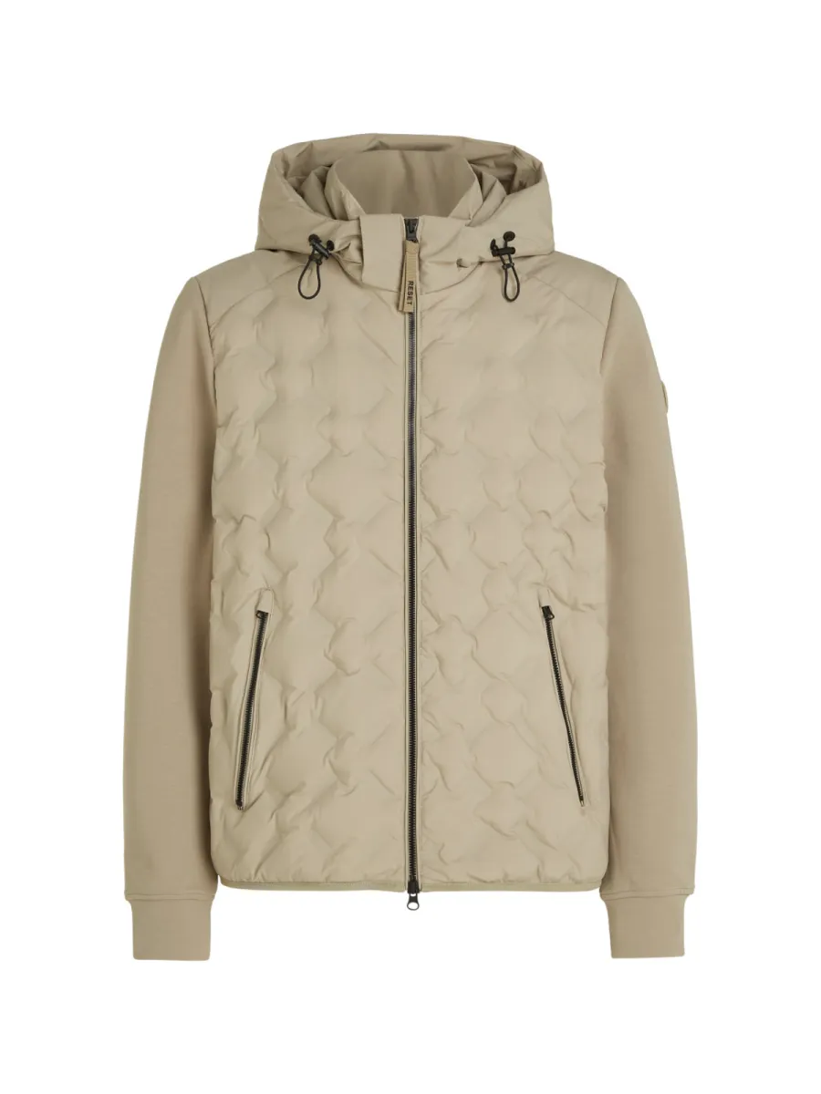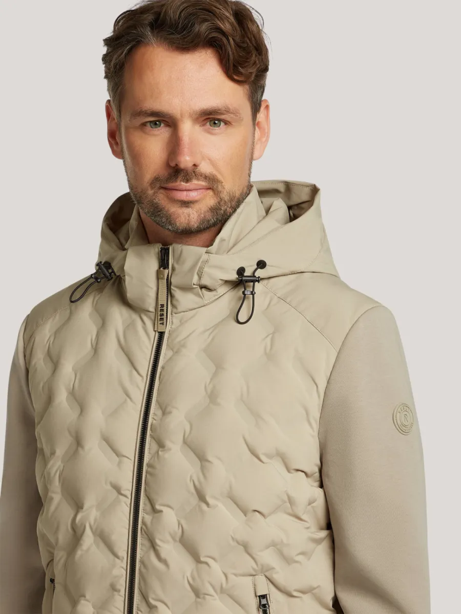 Deze beige heren hybride jas van Reset combineert een gewatteerd voorpand met donvulling en een tweekleurig quiltstiksel in een organisch patroon, met gladde sweaterstofmouwen in dezelfde kleur. De vaste capuchon heeft verstelbare trekkoorden met kunststof stoppers. De doorgaande ritssluiting heeft een “Reset”-trekker. Aan de voorzijde zijn twee diagonale ritszakken aangebracht. Op de linkermouw is een klein rond Reset-embleem aangebracht. De geribbelde manchetten sluiten de mouwen netjes af. Het hybride concept maakt hem veelzijdig: warm genoeg als lichte jas, maar soepel en bewegingsvriendelijk dankzij de zachte mouwen. Buitenstof: 100% Polyester, Voering: Dons.