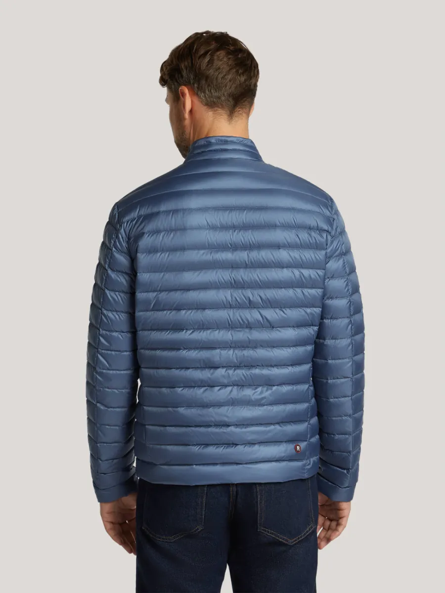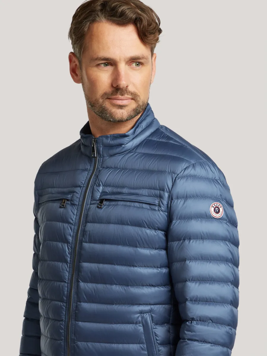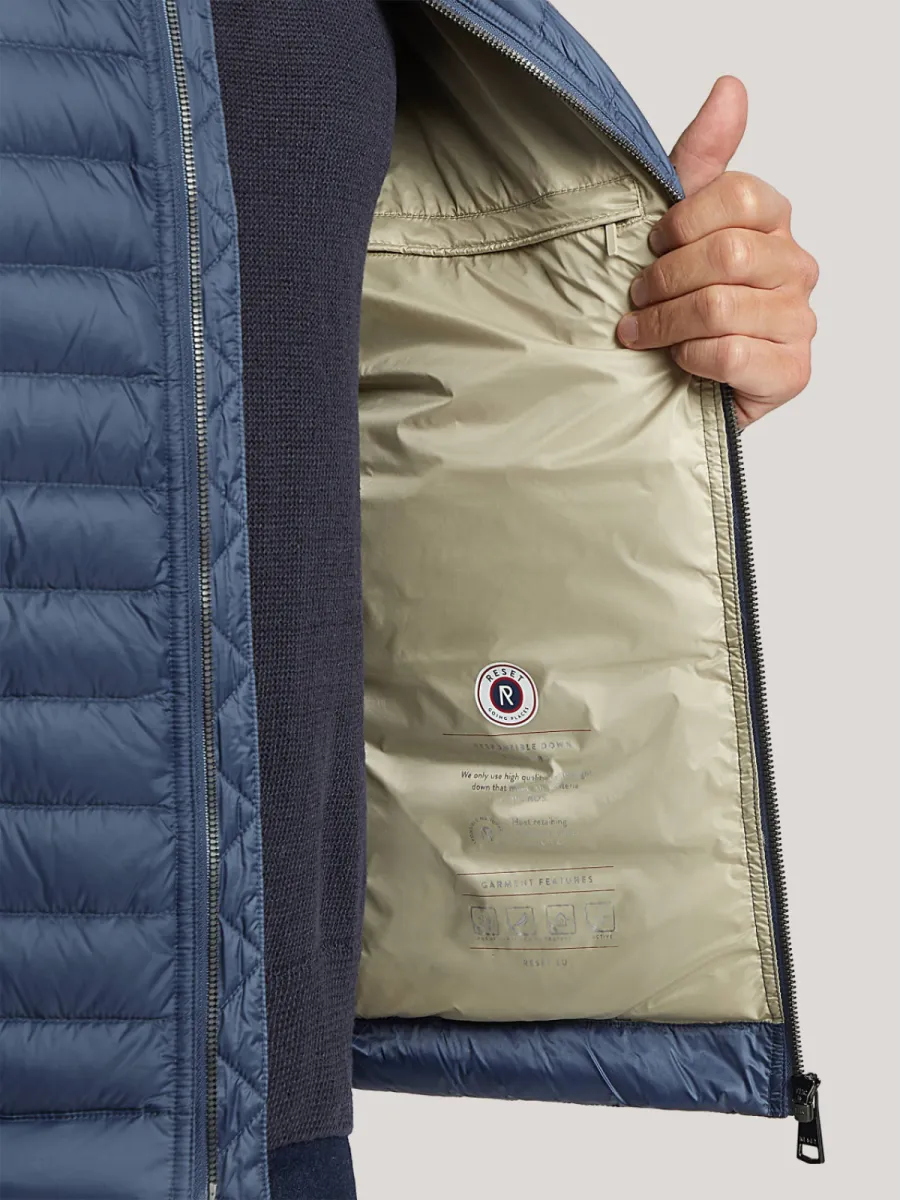 Deze blauwe lichtgewicht donjas van Reset heeft een strak gewatteerd silhouet met fijne horizontale stiksels over het gehele oppervlak. De staande kraag heeft een contrasterende ecru binnenzijde met een rood-wit detail, wat bij het omklappen zichtbaar wordt. De doorgaande ritssluiting loopt tot boven aan de kraag. Aan de voorzijde zijn twee schuine zakken met ritssluiting aangebracht, en op de borst twee kleinere ritszakjes. Op de linkermouw is een geweven Reset-embleem aangebracht. De geribbelde manchetten en zoom geven hem een nette afsluiting. De lichtgewicht donvulling biedt warmte zonder zwaar aan te voelen, wat hem geschikt maakt als tussenseizoenjas. Buitenstof: 100% Polyamide, Voering: Dons.