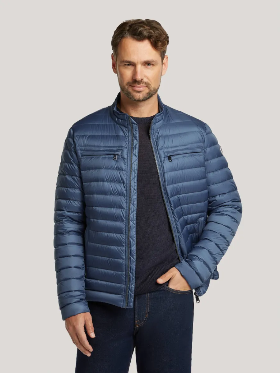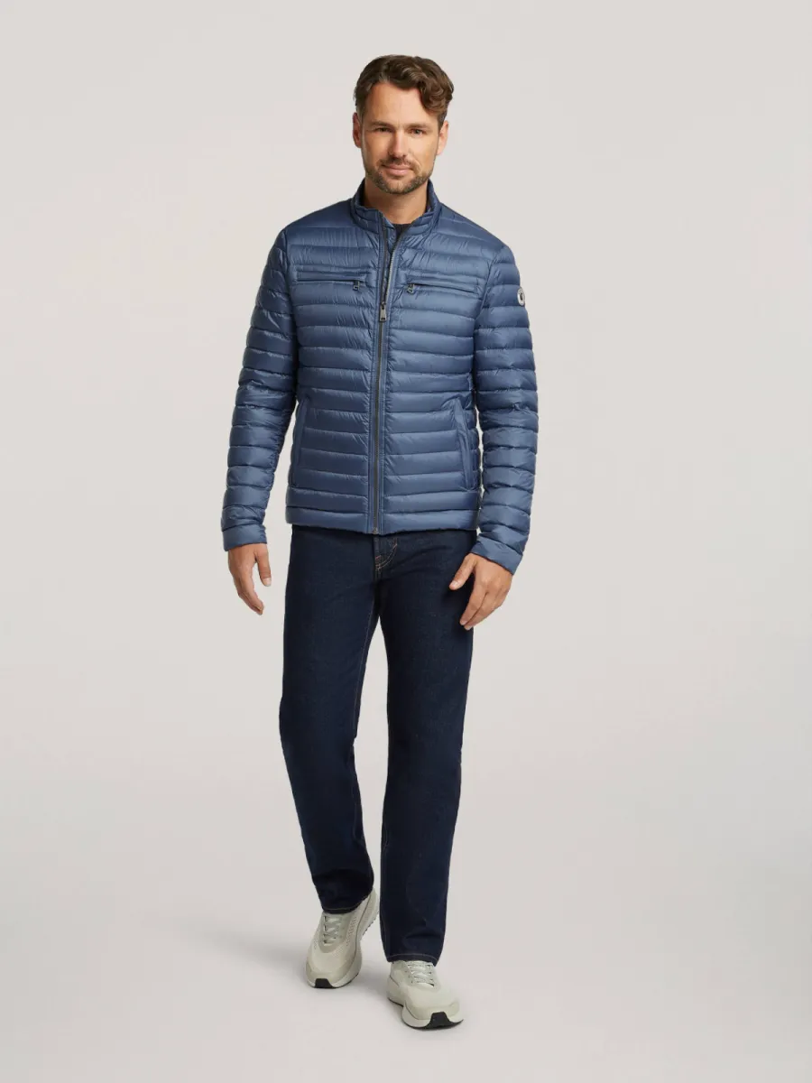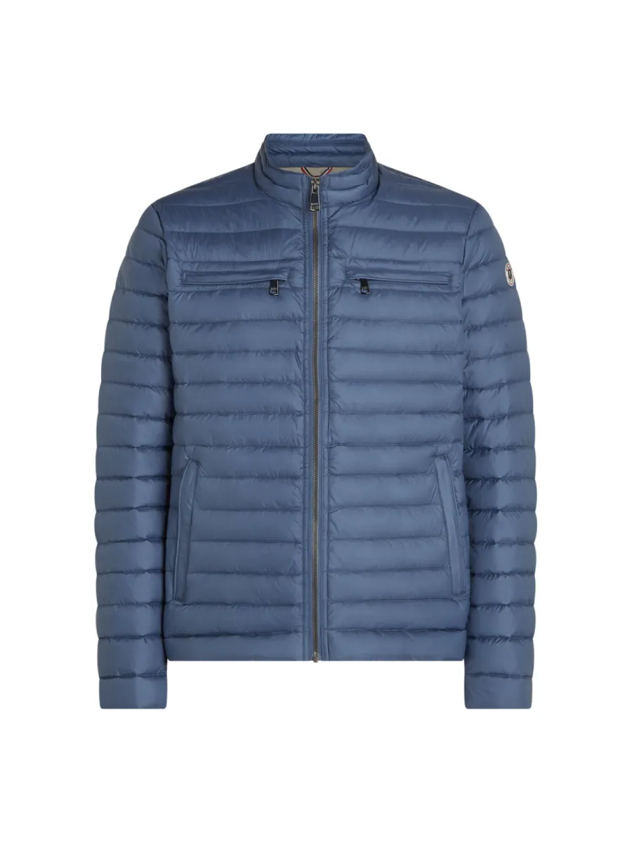 Deze blauwe lichtgewicht donjas van Reset heeft een strak gewatteerd silhouet met fijne horizontale stiksels over het gehele oppervlak. De staande kraag heeft een contrasterende ecru binnenzijde met een rood-wit detail, wat bij het omklappen zichtbaar wordt. De doorgaande ritssluiting loopt tot boven aan de kraag. Aan de voorzijde zijn twee schuine zakken met ritssluiting aangebracht, en op de borst twee kleinere ritszakjes. Op de linkermouw is een geweven Reset-embleem aangebracht. De geribbelde manchetten en zoom geven hem een nette afsluiting. De lichtgewicht donvulling biedt warmte zonder zwaar aan te voelen, wat hem geschikt maakt als tussenseizoenjas. Buitenstof: 100% Polyamide, Voering: Dons.