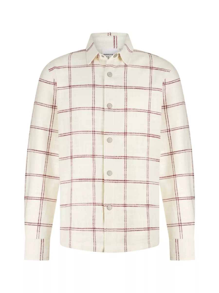 Dit overshirt van Supply & Co heeft een gebroken witte kleur met een groot ruitpatroon van bordeauxrode lijnen op een open linnen-achtige stof. De ruiten zijn breed en geven het overhemd een klassiek Brits karakter met een eigentijdse, oversized toepassing. De klassieke kraag en knoopsluiting met lichtgrijze knopen geven hem een nette, sobere afwerking. De luchtige stofsamenstelling maakt hem geschikt als lichte tussenlaag of als zelfstandig overhemd op warmere dagen. Draag hem over een effen wit T-shirt voor een moeiteloze, gestapelde look.