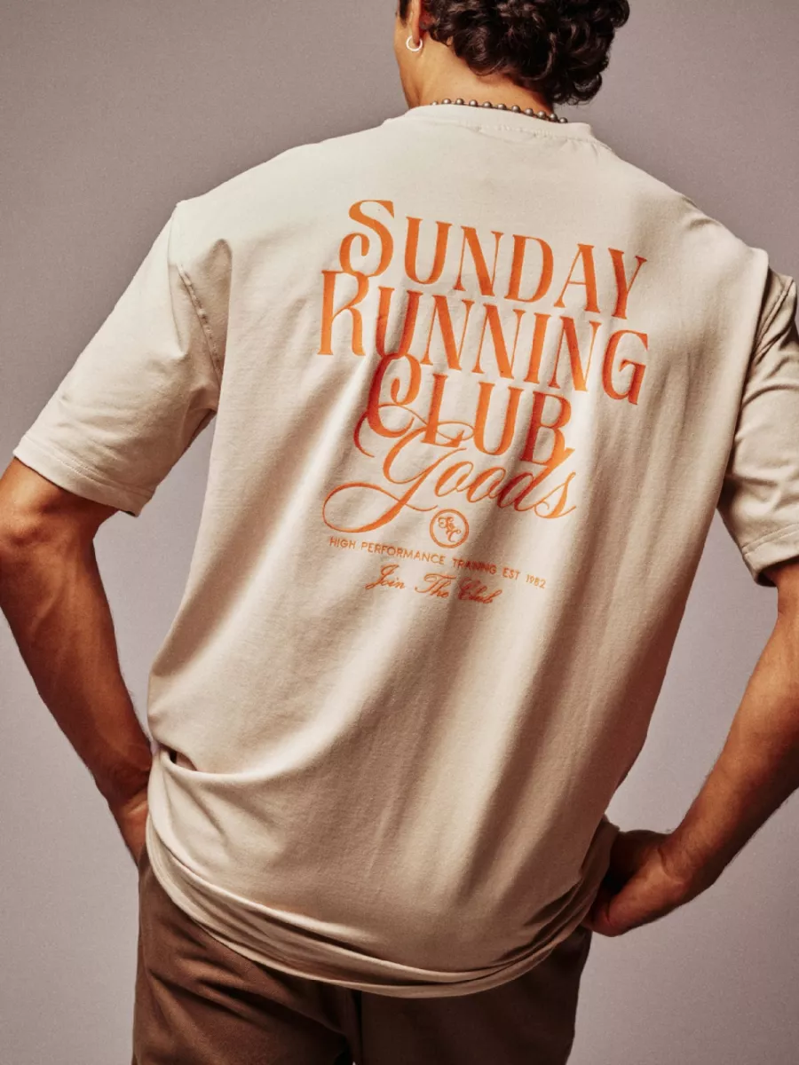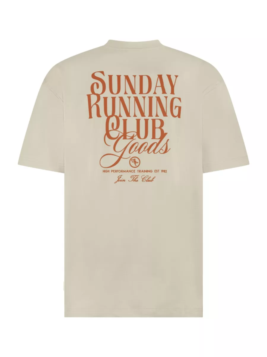• Grote grafische “Sunday Running Club Goods” backprint in oranje decoratief letterschrift
