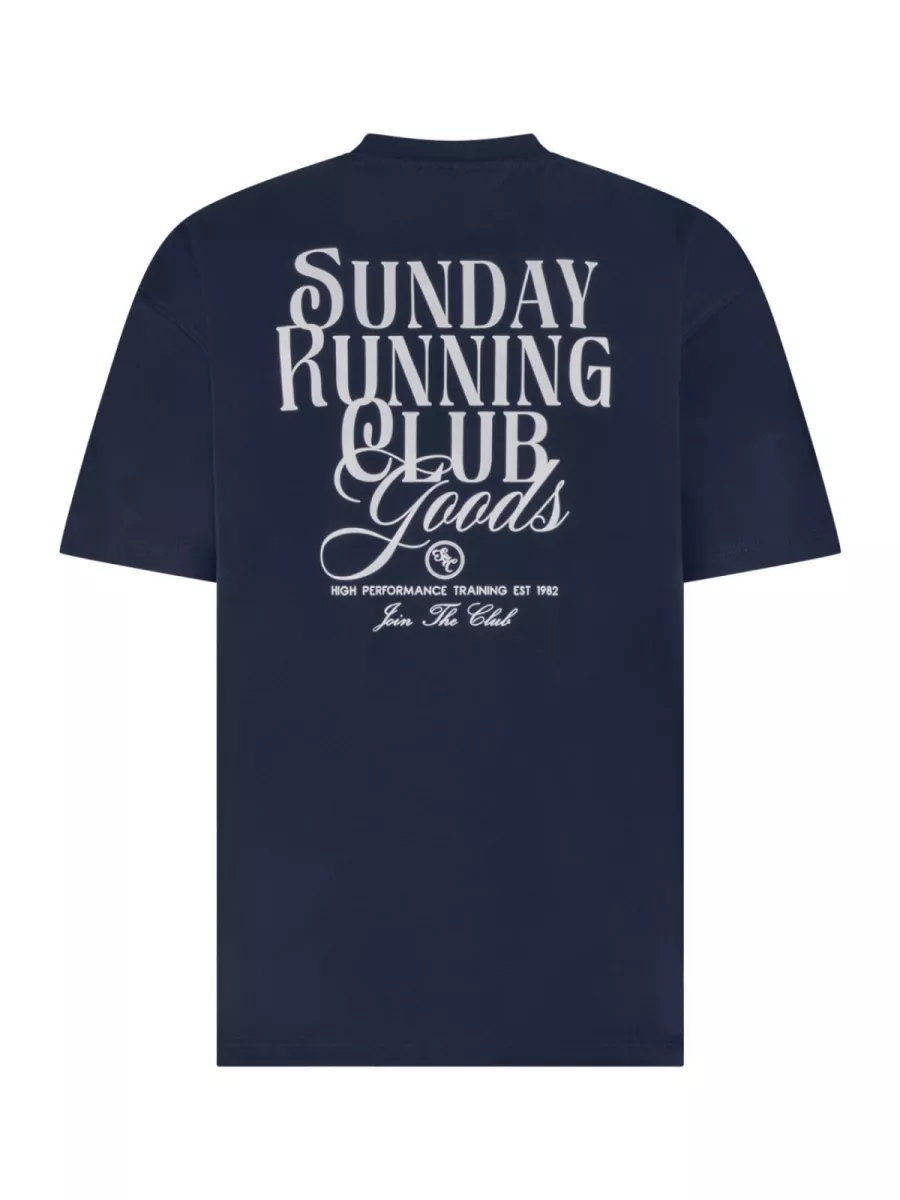 Dit T-shirt van Supply & Co heeft een donkerblauwe kleur met een klein geborduurd hardlopend figuur op de borst in wit. Op de rug staat een grote grafische print met de tekst “Sunday Running Club Goods” in een decoratief letterschrift in lichtgrijs-witte tinten, aangevuld met “High Performance Training Est 1982” en “Join The Club”. De licht oversized pasvorm en de licht verhoogde ronde hals geven hem een eigentijds, casual karakter. De katoen-elastaan stof draagt zacht en comfortabel. Draag hem met een jeans of short voor een relaxte look.
