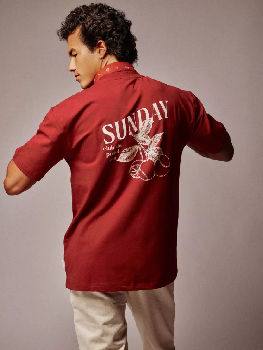Dit T-shirt van Supply & Co heeft een diepe bordeauxrode kleur met een klein tonal geborduurd s&Co logo op de borst. Op de rug staat een grafische print met de tekst “Sunday Club de Padel” in een serif letterschrift in ecru, aangevuld met een botanische tekening van citrusfruit in dezelfde ecru tint. De licht oversized pasvorm en de verhoogde ronde hals geven hem een eigentijds, casual karakter. De katoen-elastaan stof draagt zacht en comfortabel. Draag hem met een ecru broek of jeans voor een uitgesproken maar relaxte look.