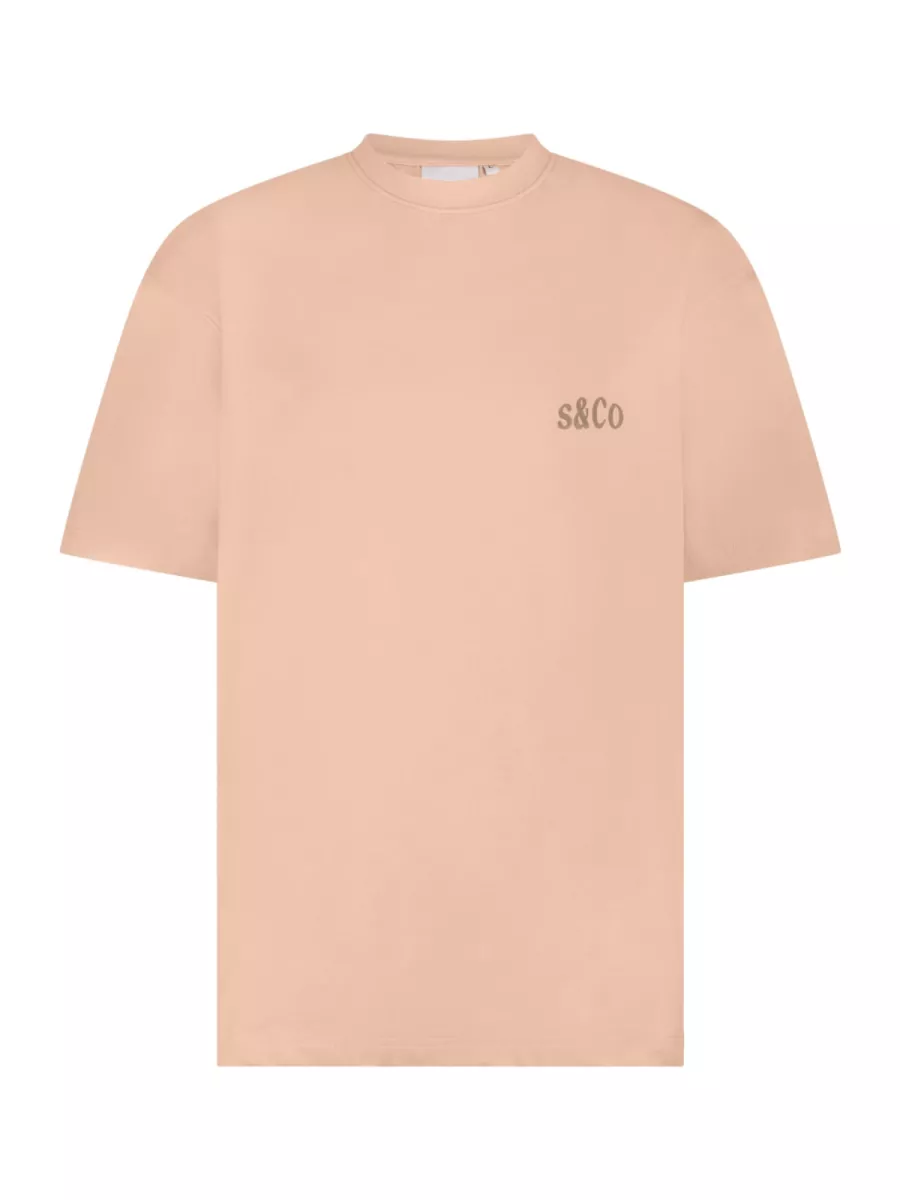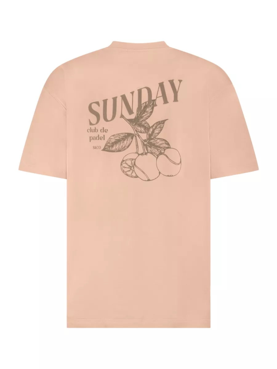 Dit T-shirt van Supply & Co heeft een warme zandroze kleur met een klein tonal geborduurd s&Co logo op de borst. Op de rug staat een grafische print met de tekst “Sunday Club de Padel” in een serif letterschrift in een gedempte bruine tint, aangevuld met een botanische tekening van citrusfruit in dezelfde tint. De licht oversized pasvorm en de verhoogde ronde hals geven hem een eigentijds, casual karakter. Combineer hem met een bruine of ecru broek voor een samenhangende warme zomerlook.