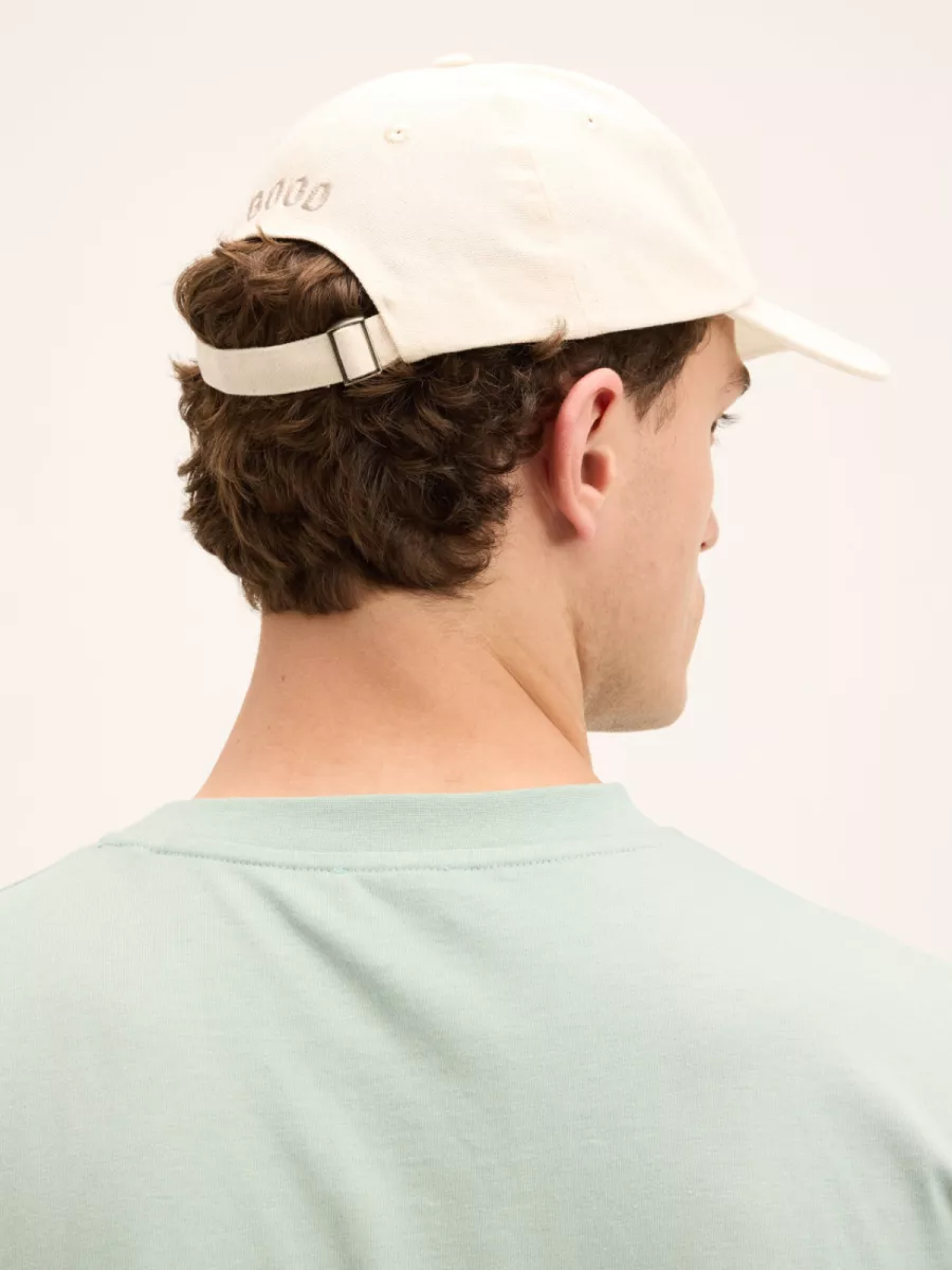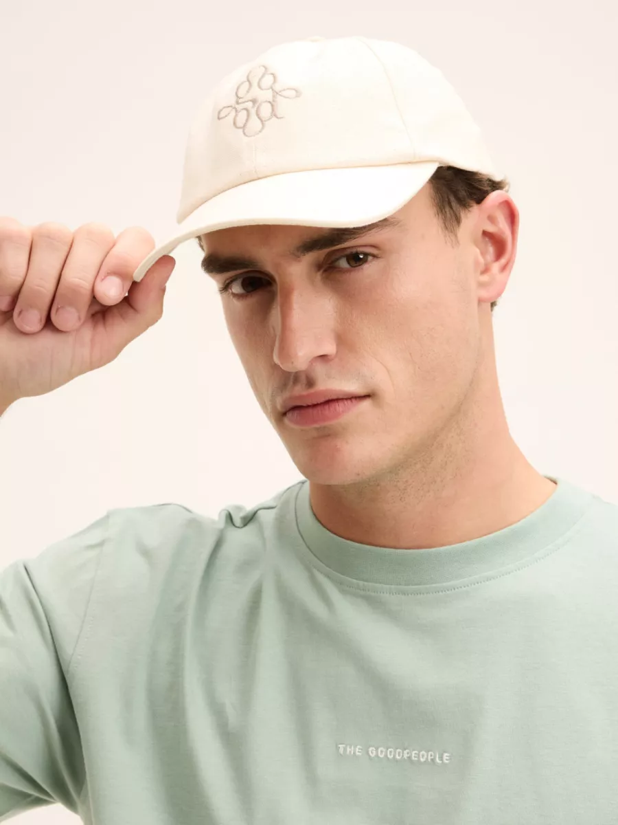 Deze gebroken witte heren pet heeft een klassiek gebogen klep en een gestructureerde bol met ventilatieopeningen aan de bovenzijde. Op de voorkant is het gestileerde “good”-logo van The GoodPeople geborduurd in een toonvaste grijze draad. De stof heeft een licht canvas-achtige textuur die de pet een robuust maar fris karakter geeft. De neutrale gebroken witte kleur maakt de pet breed combineerbaar met vrijwel elke zomerlook. Gemaakt van 100% katoen.