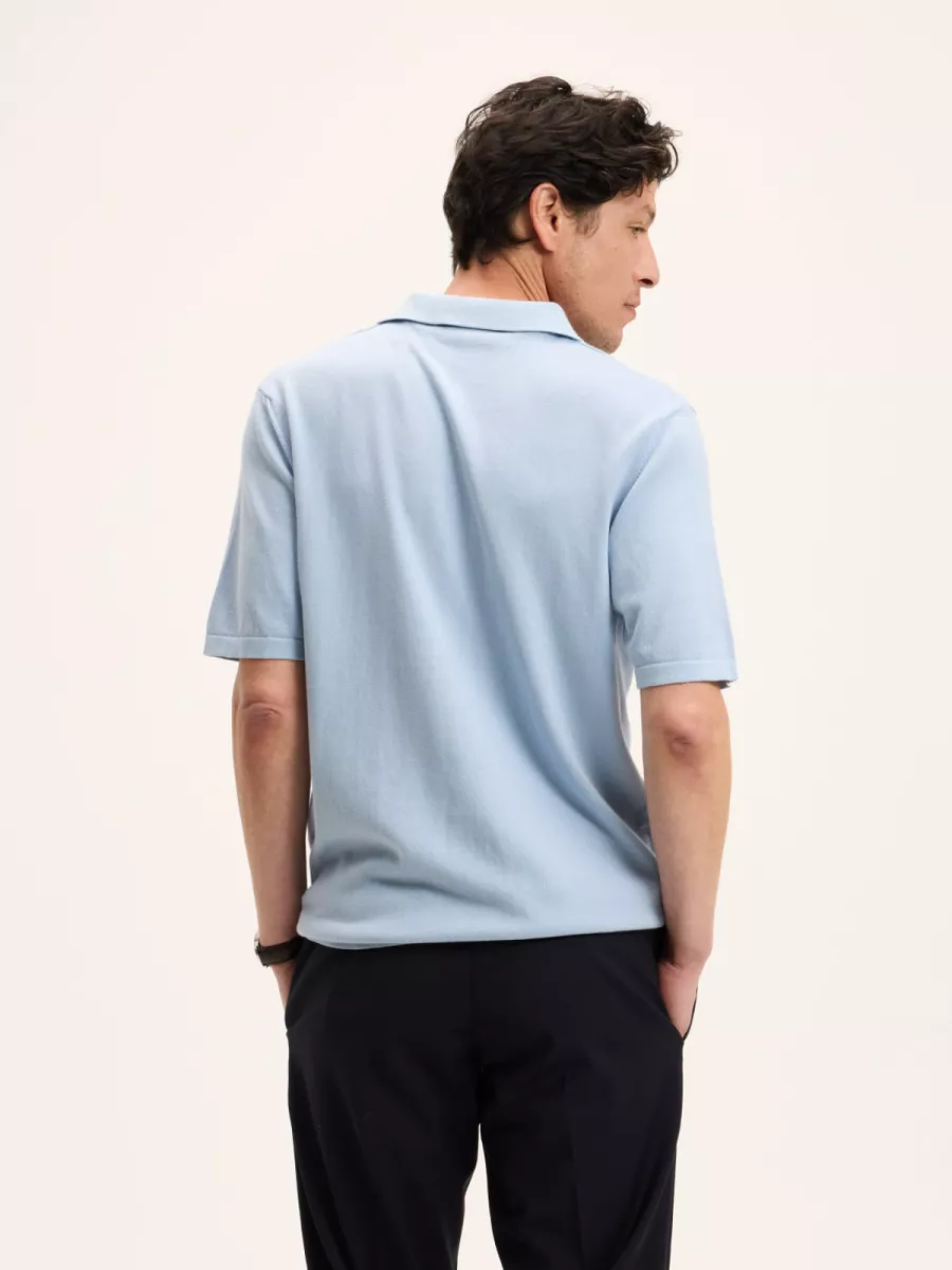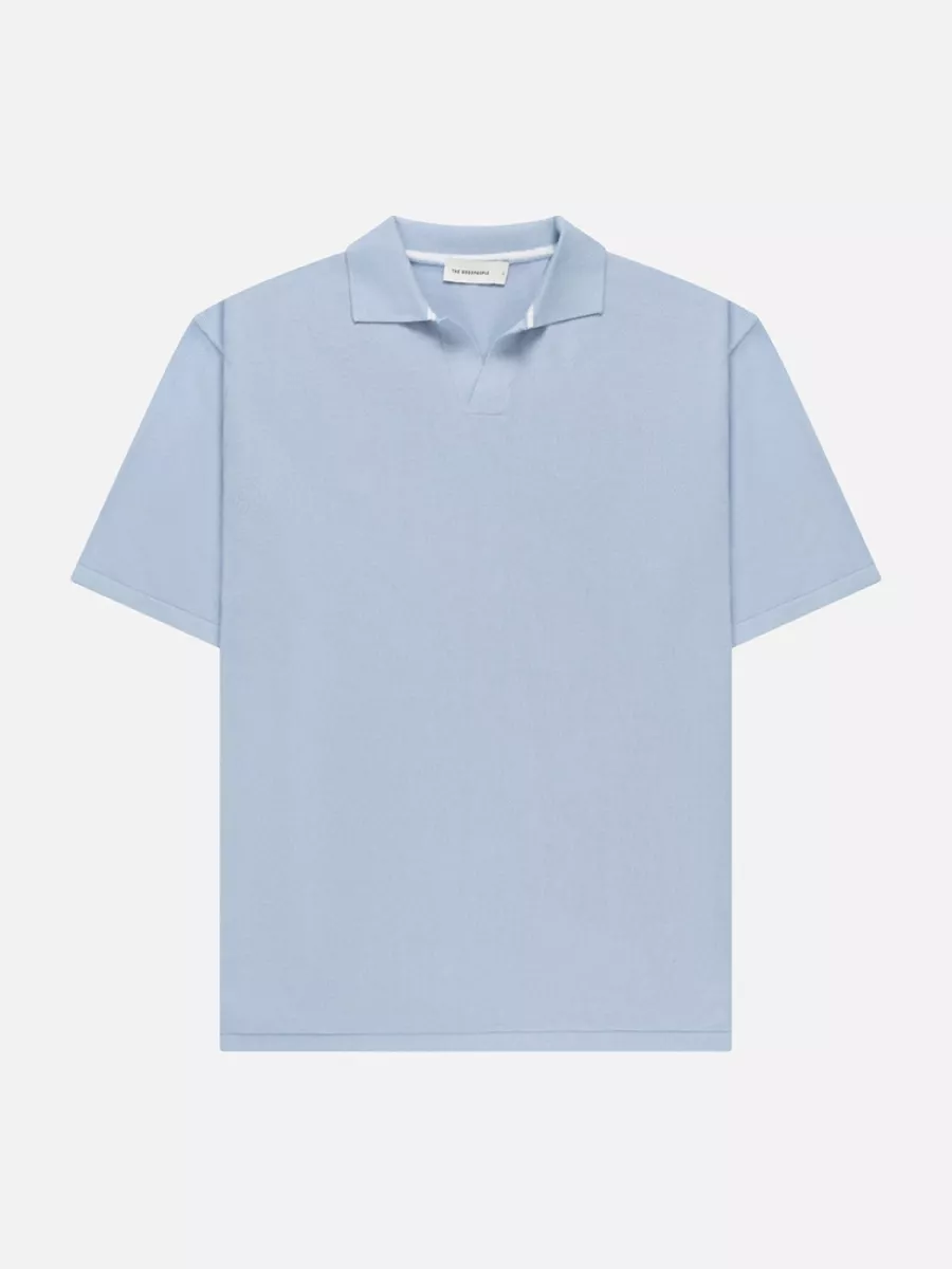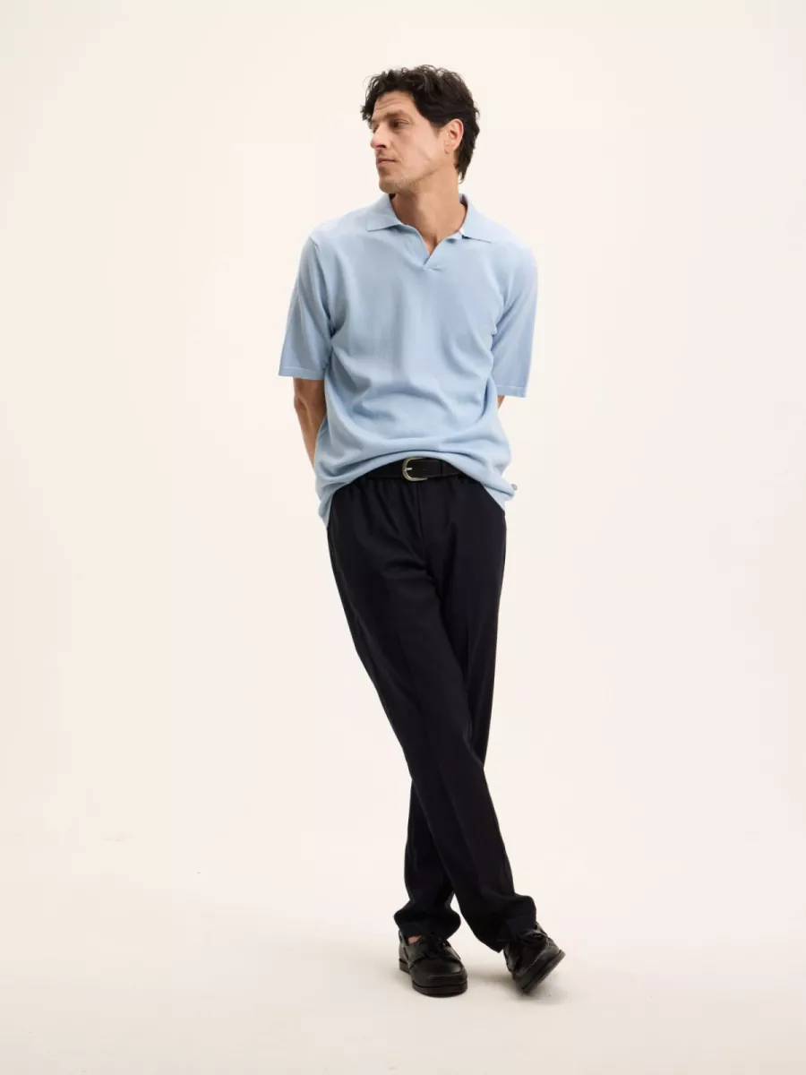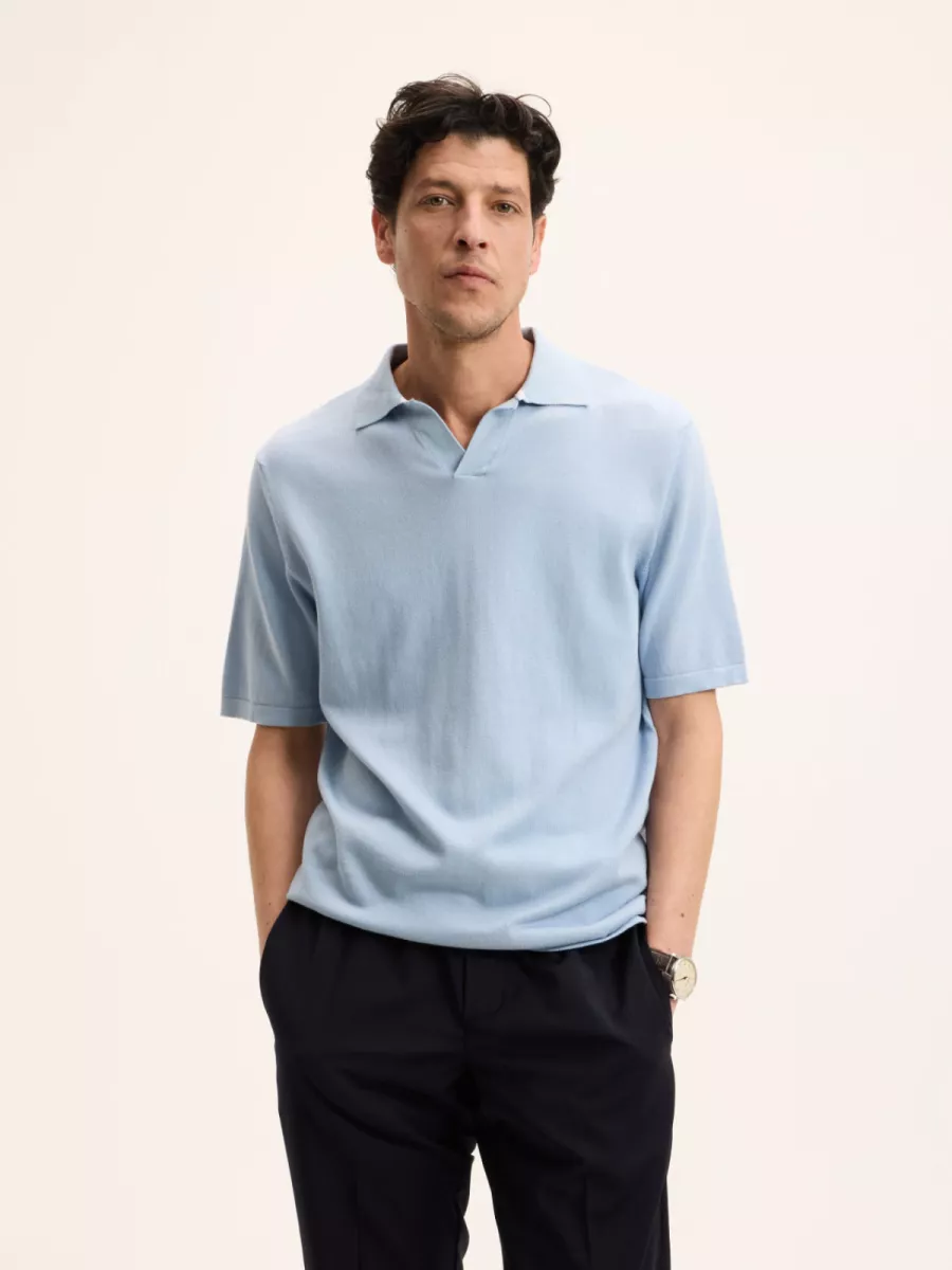 Deze lichtblauwe heren polo heeft een open polokraag zonder knoopsluiting, wat het stuk een luchtig en ontspannen karakter geeft. De polo is vervaardigd in een fijne gebreide kwaliteit zonder zichtbare logodetails op de voorkant. De relaxte pasvorm met korte mouwen draagt moeiteloos op warmere dagen. De lichtblauwe kleur is fris en veelzijdig en combineert goed met een witte, beige of donkere broek. Simpel op het oog, sterk in materiaal. Gemaakt van 100% katoen.