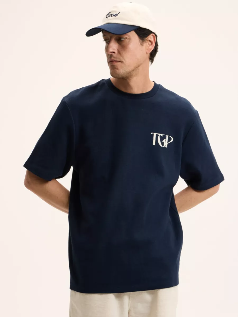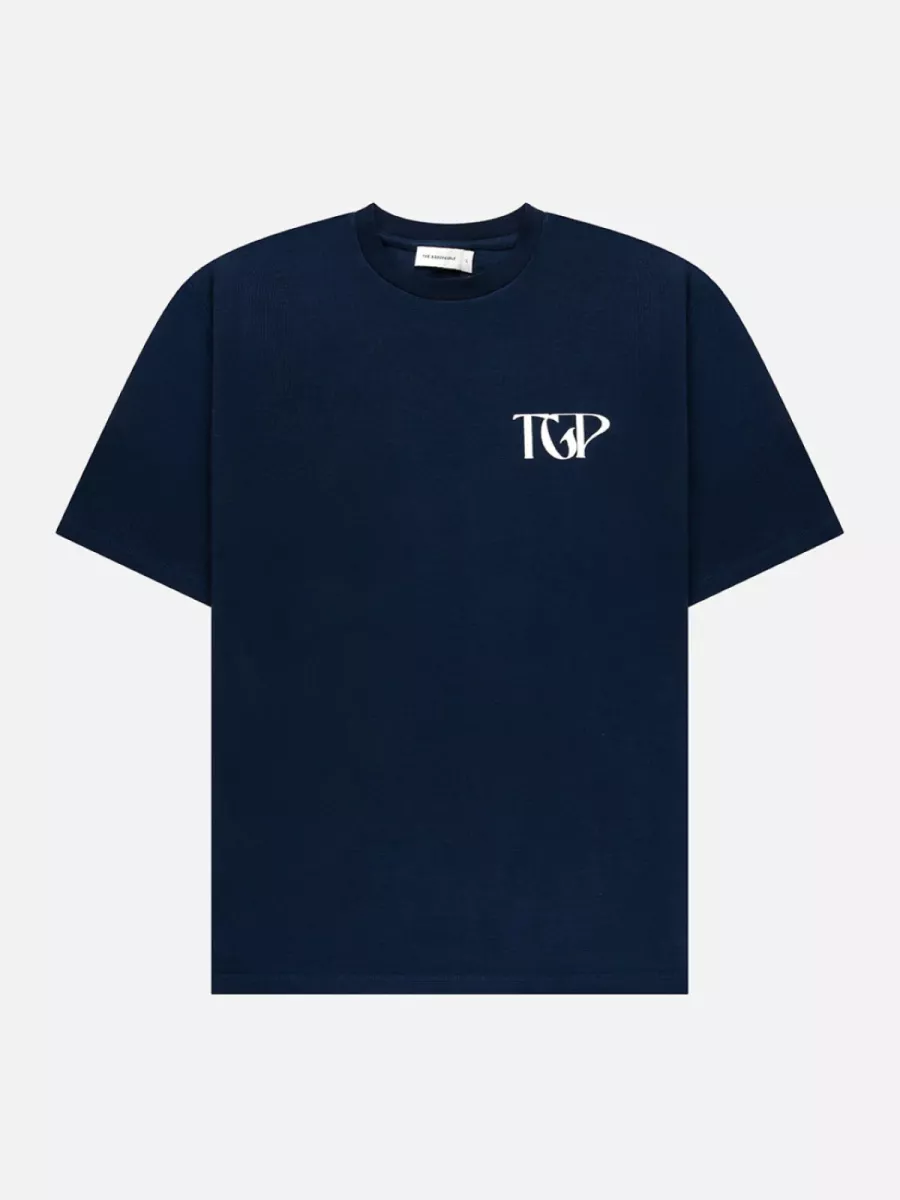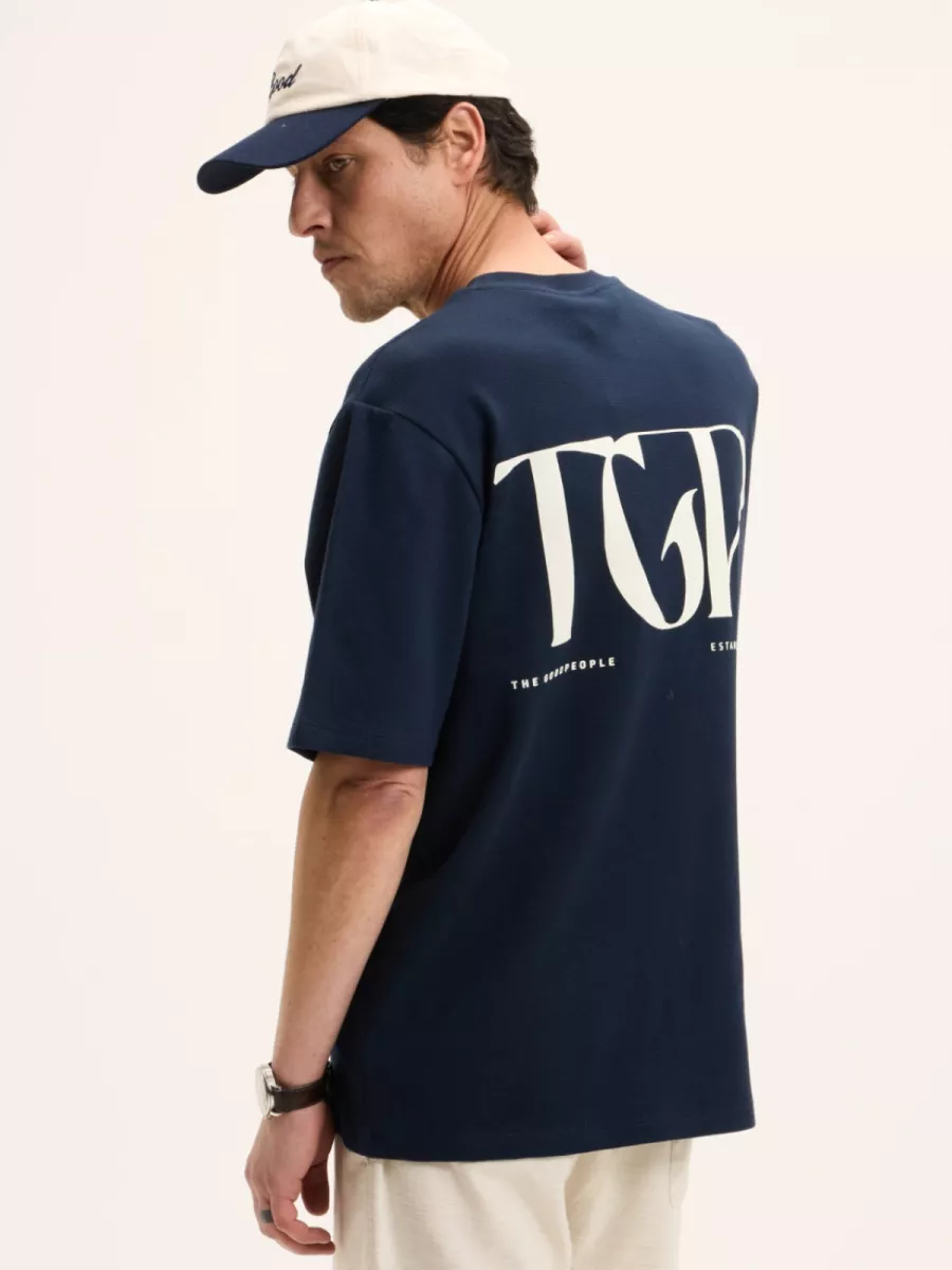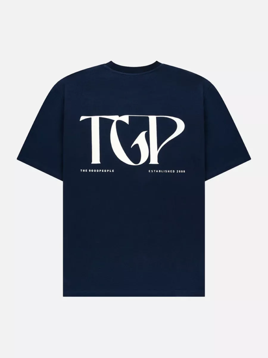 Dit marineblauw heren t-shirt heeft een ronde hals en korte mouwen met een relaxte pasvorm. Op de linkerborst staat het “TGP”-logo van The GoodPeople geprint in wit — subtiel, maar herkenbaar. Op de achterkant is een groot grafisch print aangebracht met de letters “TGP” in een decoratief lettertype, met daaronder de tekst “The GoodPeople — Established 2008” in wit. Het shirt draagt licht, combineert moeiteloos en zegt toch iets over wie je bent. Gemaakt van 100% katoen.
