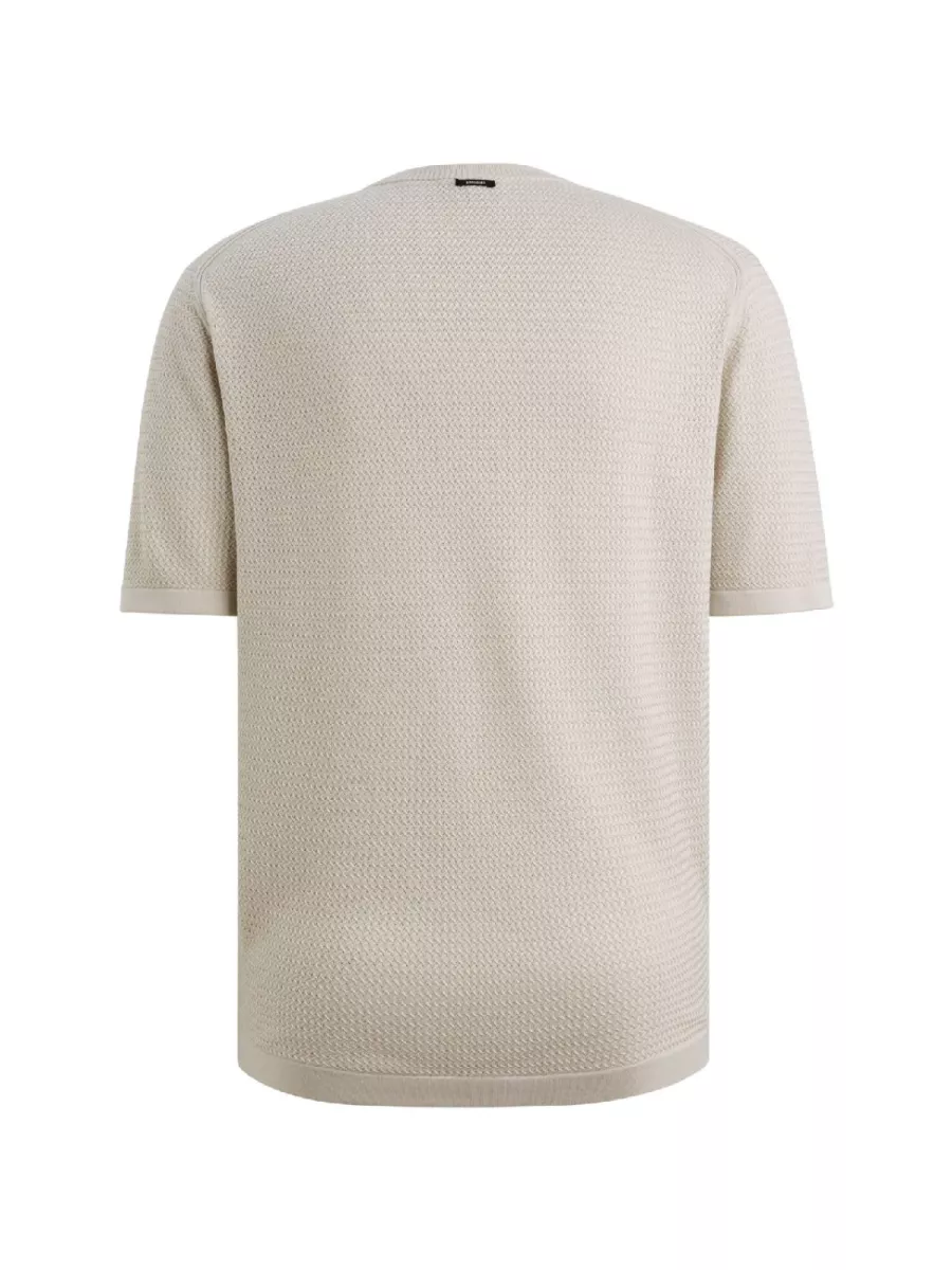 Dit beige T-shirt heeft een fijngebreide structuur die zorgt voor een verzorgde uitstraling. Vanguard richt zich met dit ontwerp op de volwassen man die waarde hecht aan een combinatie van comfort en een herkenbare vrijetijdslook. De lichte kleur en de ronde hals maken het kledingstuk gemakkelijk te combineren met een jeans of chino. Op de borst bevindt zich een subtiel, donker merklabel met witte letters dat de identiteit van het merk bevestigt. Door de ribgebreide boorden bij de mouwen en de onderzijde blijft de pasvorm gedurende de dag goed behouden.