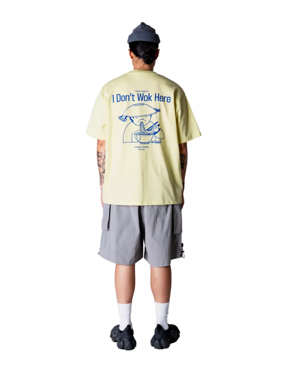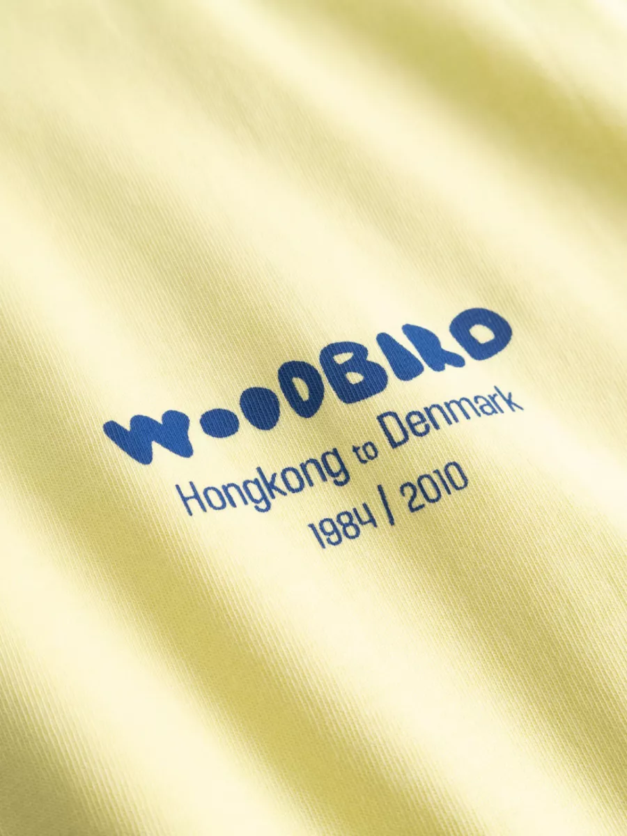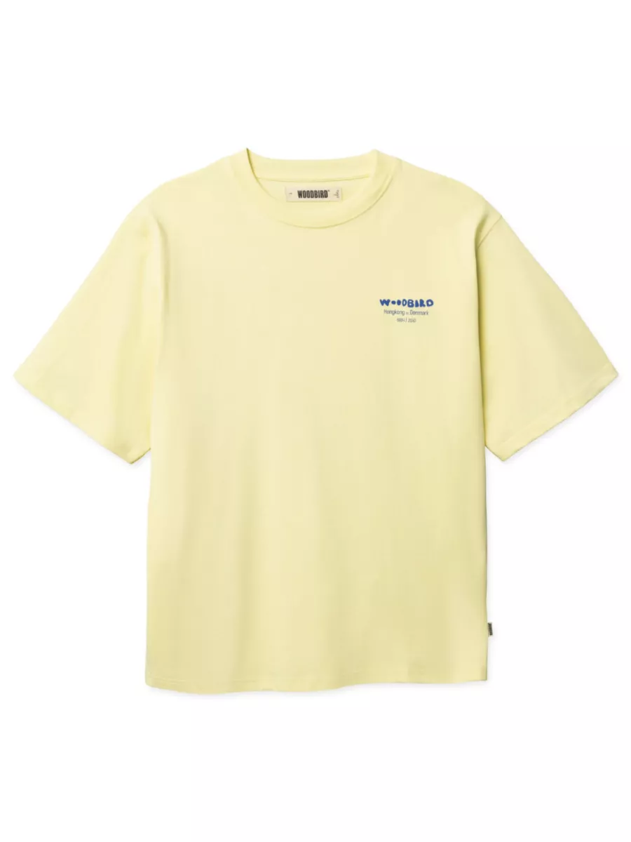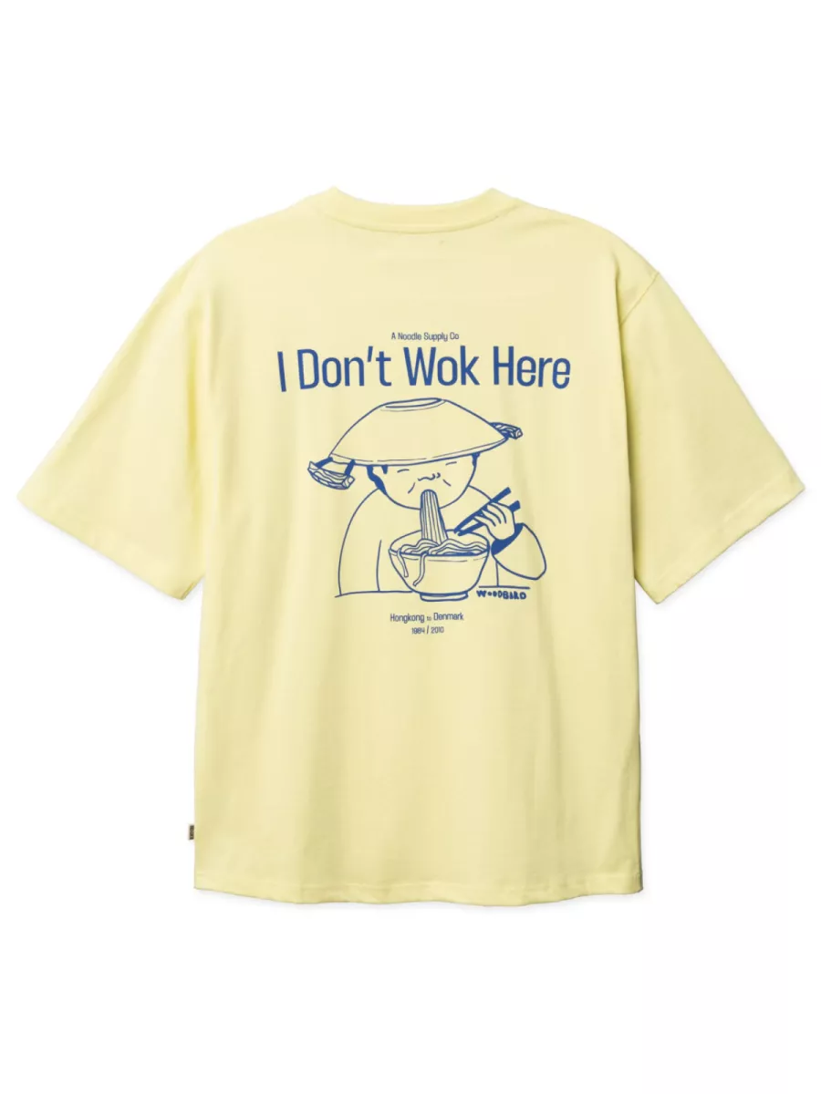 Dit lichtgele oversized t-shirt van Woodbird heeft dezelfde humoristische backprint als zijn groenere tegenhanger: “I Don’t Wok Here” in grote letters, met daaronder een getekende figuur die noodles eet. De print is uitgevoerd in blauw, wat een frisse en speelse uitstraling geeft op het zachte gele fond. Op de linkerborst staat het Woodbird-logo met de vermelding “Hongkong to Denmark – 1984/2010”. De relaxte, oversized snit zorgt voor een comfortabele draaglust die past bij de zomerse kleur. Wax yellow combineert goed met wit, navy of een neutrale broek. Gemaakt van 100% biologisch katoen.